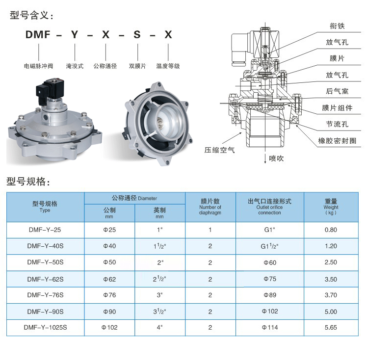 DMF-Y型電磁脈沖閥為淹沒式電磁脈沖閥(亦稱嵌入式閥),直接安裝在分氣箱上,具有更好的流通特性。壓力損失有所下降,適合于氣源壓力較低的工作場合。淹沒式電磁脈沖閥座嵌入氣包內安裝,阻力小,流通性好,噴吹量高,提高了負荷帶動量,擴大了氣源壓力的使用范圍,此淹沒式脈沖閥更適合于氣源壓力較寬場合使用。